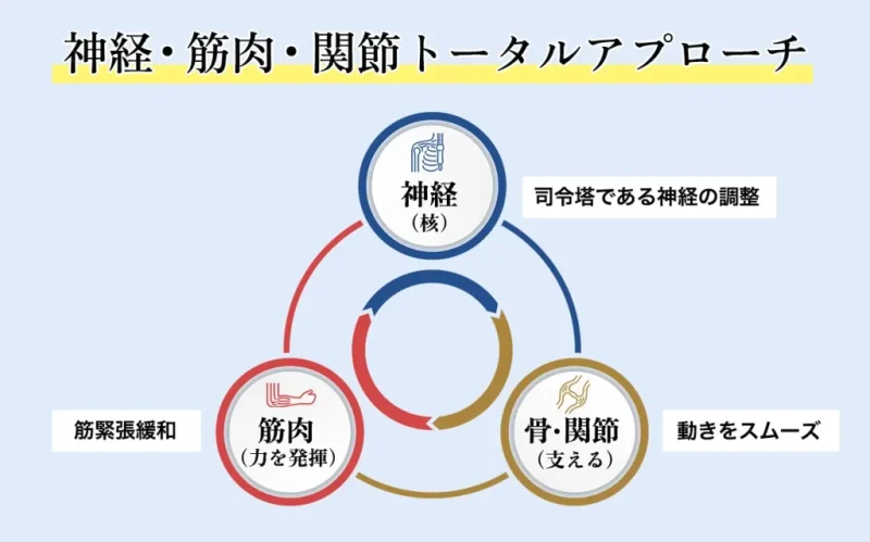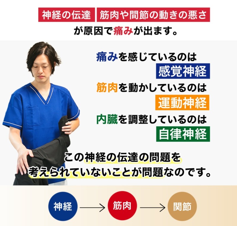 筋肉や骨格だけでなく、それらを動かす"神経"の働きに注目した「神経整体」を提供しています。