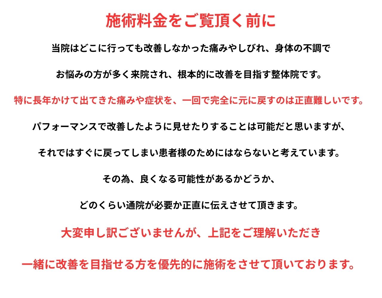 なお、「一度で治してほしい」「短時間ですぐに変化がほしい」というご要望には対応しておりません。